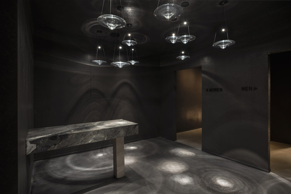 當客人通過一層的大堂進入Bathhouse,接待他們的是一個巨石般的接待臺,由石灰巖制成。照明凹槽玻璃門強調了客人的旅程和過渡,厚重的黑石后墻中央有一個垂直的燈塔,就像 “隧道盡頭的一盞明燈”。游客從一個小巧的黑色樓梯上走下來,這是引導他們踏上未知旅程的幾道門檻中的第一道。游客來到地下兩層中第一層的更衣室。