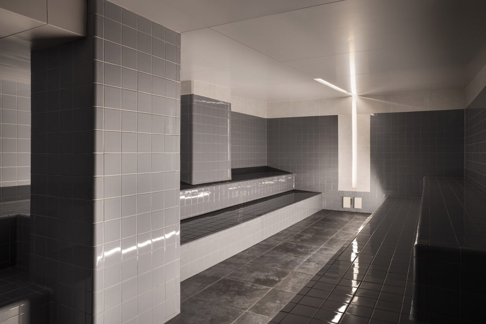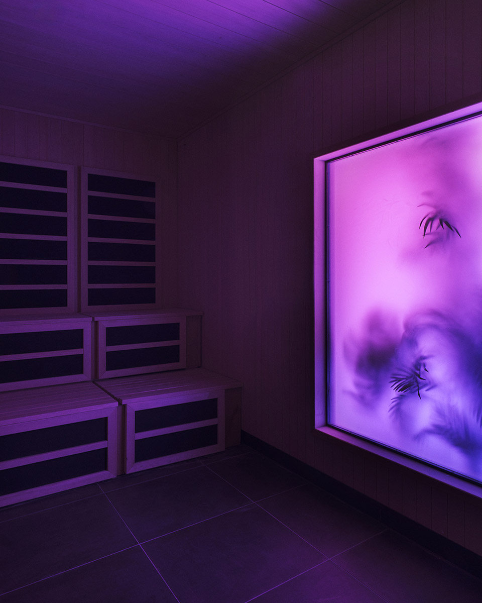 具有儀式感的桑拿房內襯雪松木,設有階梯式長凳。天花板上的海灣燈和筒燈照亮了加熱器。中央加熱器籠罩在雪松中,就像一個祭壇。桑拿大師在這里表演Aufguss,這是一種以香油、音樂和熱量為特色的感官體驗。蒸汽房采用丹麥DTILE三維瓷磚鋪設,這種模塊化系統將整個空間包裹起來,形成圓潤的邊角。藍灰色瓷磚墻面上的光條為整個空間營造了一個神秘的焦點。Banya是最火熱的俄式桑拿房,由綠色和紫色的橫向瓷磚鋪成,設有一個黑色的石制爐子。底部的長凳上有發光條。最后,紅外線桑拿房采用垂直的鐵杉木板,讓人聯想到森林環境的高度,發光的窗戶可以看到郁郁蔥蔥的植物剪影。