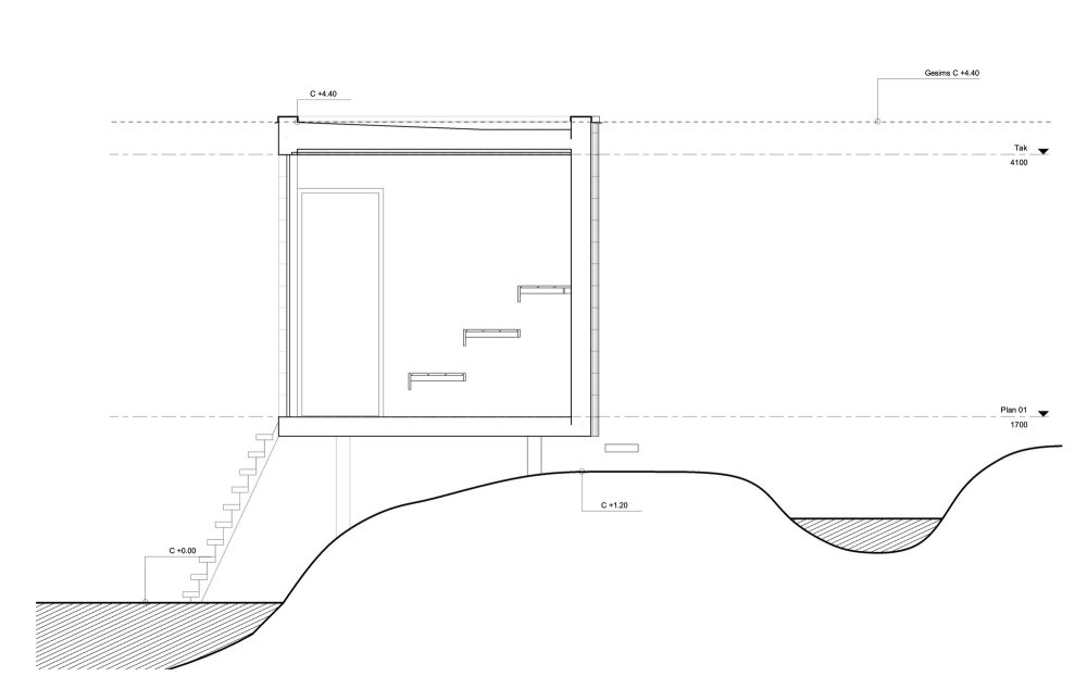 這種桑拿房概念由兩部分組成,由一條通向水和浴梯的開放式狹窄通道分割開來。右邊的部分有兩個小型更衣室和必需品儲藏室。左側是一個熱水間,配有一個木制火爐、一面圓潤、充滿社交氣息的后墻,以及一扇面向大城市天際線的全景窗戶。