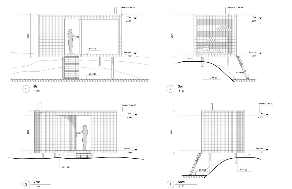 奧斯陸工程公司希望最大限度地減少對氣候的影響,同時降低視覺效果和維護要求。因此,小木屋由巨大的木模塊組成,外覆燒過油的礦松木瓦。這些模塊可以很容易地運輸到位于光滑的海邊巖石邊緣、交通不便的地段。