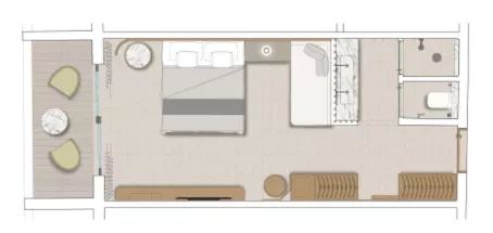 面積為 60㎡ 的私人套房位于酒店一層,帶戶外花園景觀及私人泳池,室內有臥室和獨立的客廳;擁有兩間臥室的套房則為45㎡,同樣設有獨立的客廳;每套每晚的房價在人民幣2500元-3000元之間。