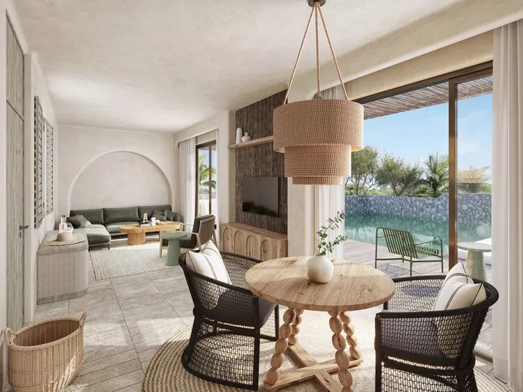 梯田般的客房依山而建,設計師保留原有的建筑,并現有基礎上增加了新的元素,打造波西米亞般的自由田園風格,使人即使在室內也如常親近自然。木材質感同樣與中央泳池花園的橄欖樹、棕櫚樹等植物景觀達到統一。