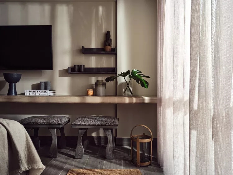 客房延續公區的奶油色水泥墻面,設計簡約、質樸。在家具、軟裝、客用品的選擇上,以原木色的家具搭配棉麻織物,讓房間內充滿自然、原始的氛圍,加強了溫度感。