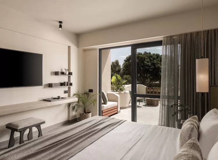 一排整齊栽種的檉柳樹隔斷了愛琴海浪花的喧囂,灰色樹干和灰綠的葉子質樸、新鮮、充滿活力與質感,仿佛在宣示 Numo Ierapetra 度假酒店的格調。