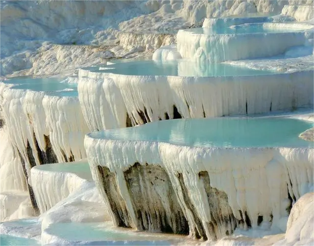 棉花堡海拔384米,這里的溫泉水富含鈣和鎂的硫酸鹽及重碳酸鹽等,水溫介于36-38攝氏度之間,PH值為6。據科學鑒定,泉水富含鈣、鎂等礦物質,不但對疾病有神奇療效,泉水還可飲用。棉花堡區附近,三三兩兩散落著碧綠的溫泉泳池。 14000年來,···